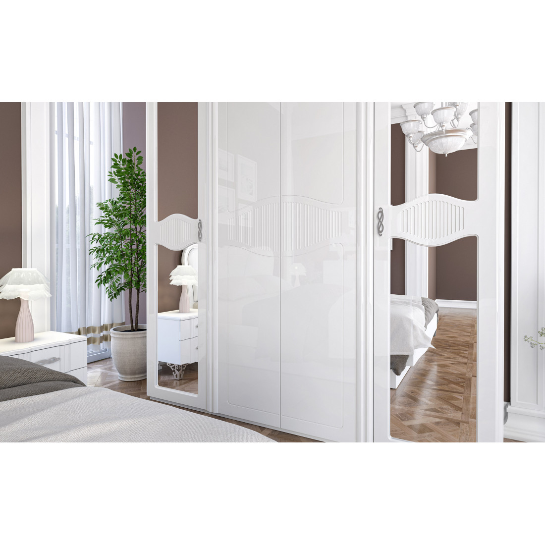 Четырехстворчатый шкаф для одежды и белья МН-025-24 в спальню серии София (Мебель-Неман) выполнен в светлом кремовом оттенке с благородным глянцем. Благодаря зеркальным створкам по всей высоте, большой гардероб с легкостью вписывается в общий интерьер, визуально делая пространство большим. Купить большой гардеробный шкаф в комнату – забыть о проблеме недостатка места для белья и вещей навсегда.