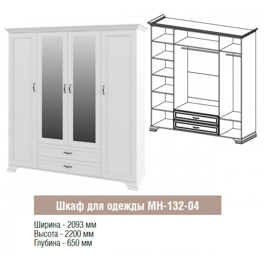 Шкаф Юнона МН-132-04 от фабрики Мебель-Неман - это четырехстворчатый шкаф для одежды с зеркалом в классическом стиле с отделкой структурной фактуры, обрамленный рамочным фасадом, где металлические ручки выгодно подчёркивают стиль и изящество, всегда актуален и востребован.
