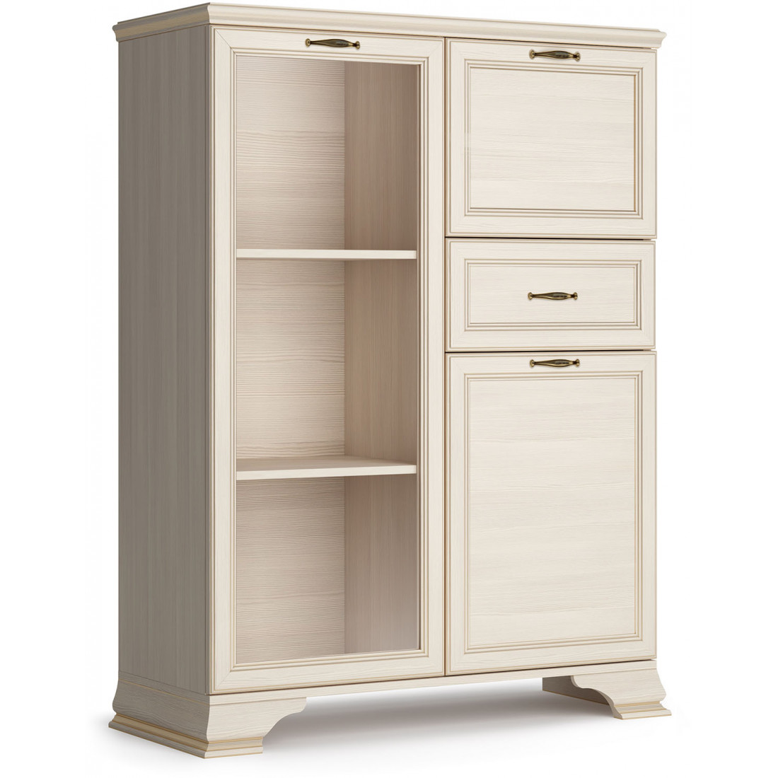 Подбирая мебель для гостиной, вы найдете все необходимые модули для размещения книг, посуды, памятных мелочей и телевизионной техники. Стандартная комплектация шкафа-витрина и шкафов низких предусматривает полки ЛДСП, однако отдельной опцией к ним предлагаются стеклополки.