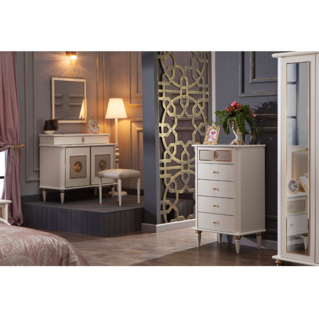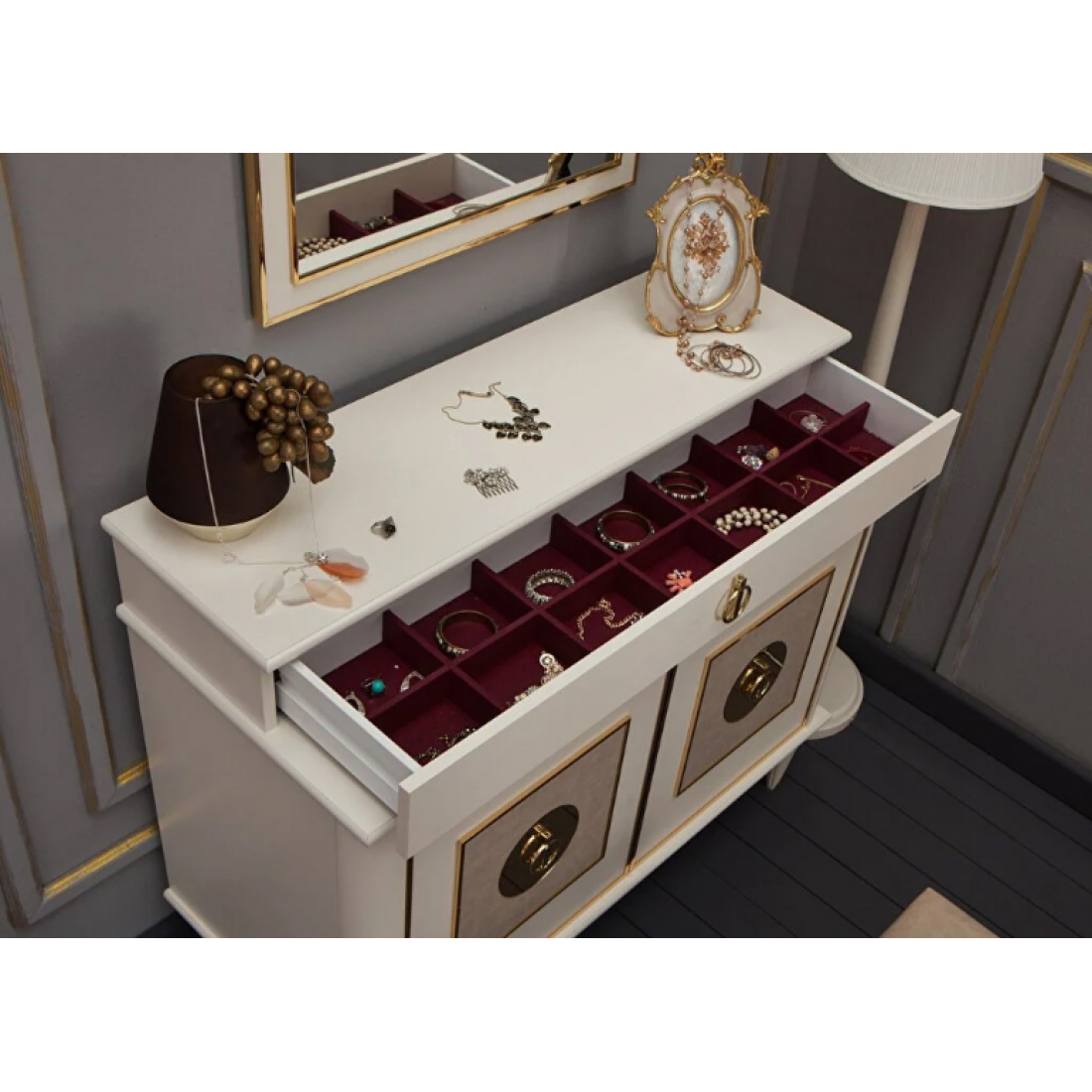 Комод- туалетный столик Mistral дополнит вашу спальню. В вернем ящике- разделитель отделанный тканью для украшений (можно не ставить), за дверцами- деревянная полка