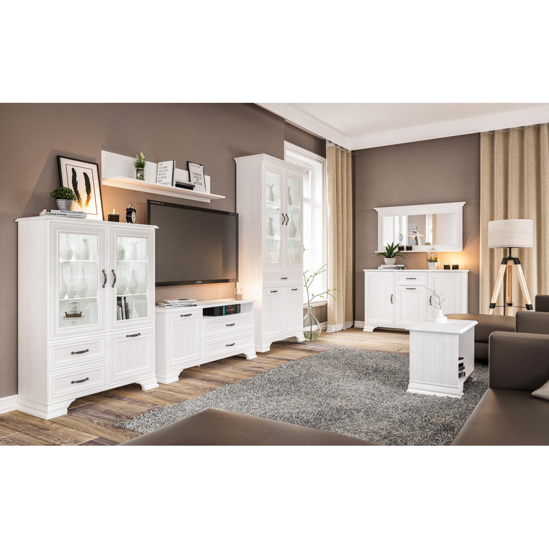 Мебель для гостиной Юнона композиция 2 от фабрики Мебель-Неман - это новинка 2019 года в классическом стиле с отделкой структурной фактуры, обрамленная рамочным фасадом, где металлические ручки выгодно подчёркивают стиль и изящество, всегда актуальна и востребована. Полки у шкафов-витрин и тумбы - стеклянные.