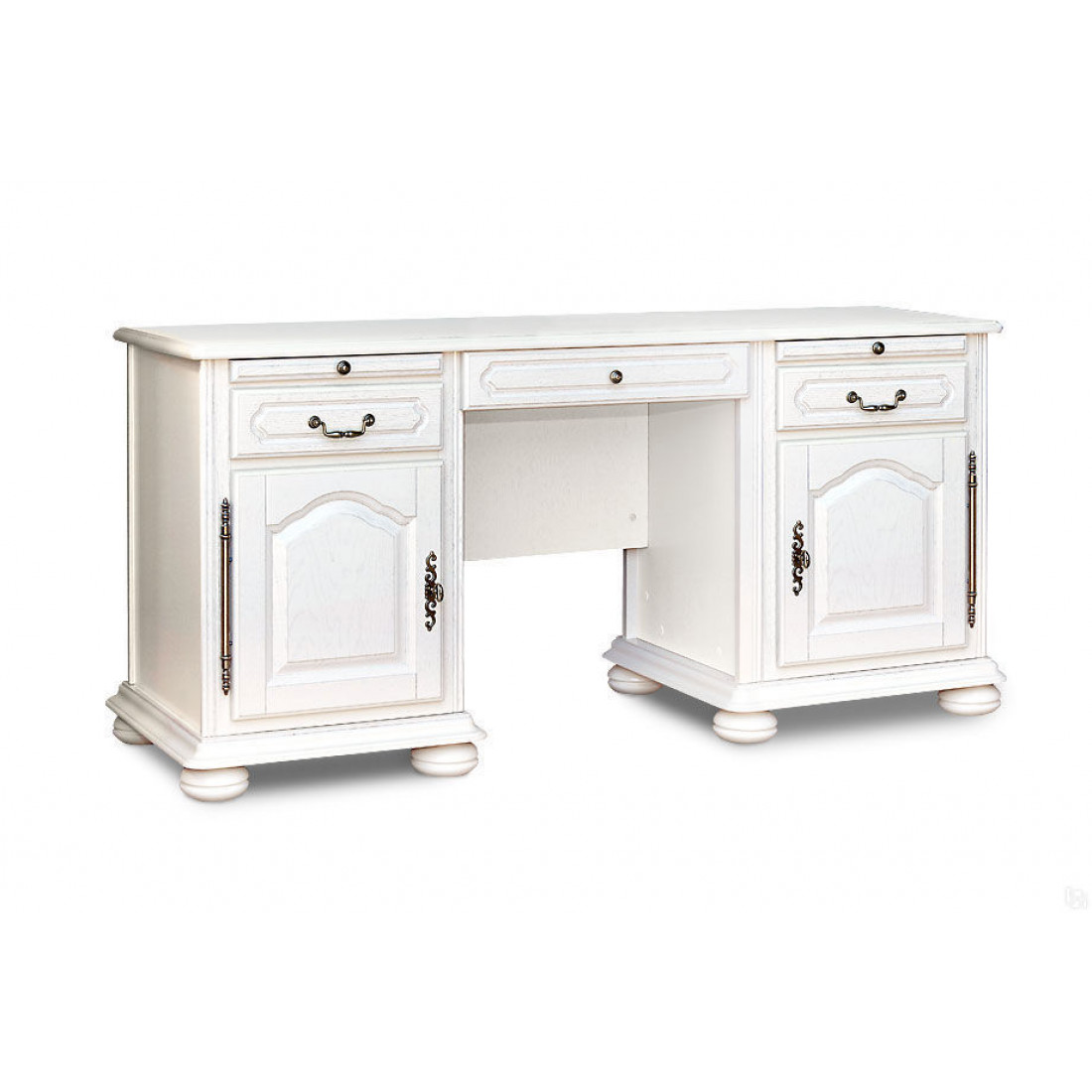 Классический письменный стол с двумя тумбами из коллекции мебели из массива дуба "Давиль" станет прекрасным дополнением интерьера гостиной или кабинета. Площадь столешницы можно увеличить за счет выдвижных полок. Внутри левой тумбы также есть выдвижные полки и ящик, в правой - полка для системного блока. Выполнен в цвете "Белая эмаль".