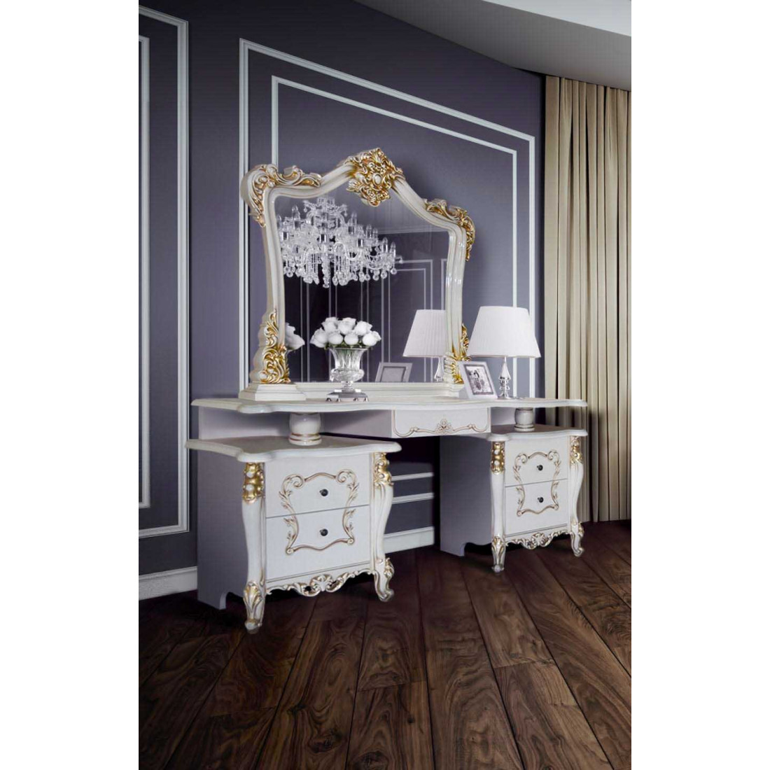 Туалетный столик с зеркалом Джоконда (слоновая кость) от Российской фабрики «ДИА мебель» выполнена в белом цвете. Ручки цвета позолоты и глянцевое покрытие придадут богатую атмосферу в спальне.Вместительный столик комплектуется зеркалом. Столик выполнен в стиле бароккко, подчеркнет чувства стиля своего владельца.