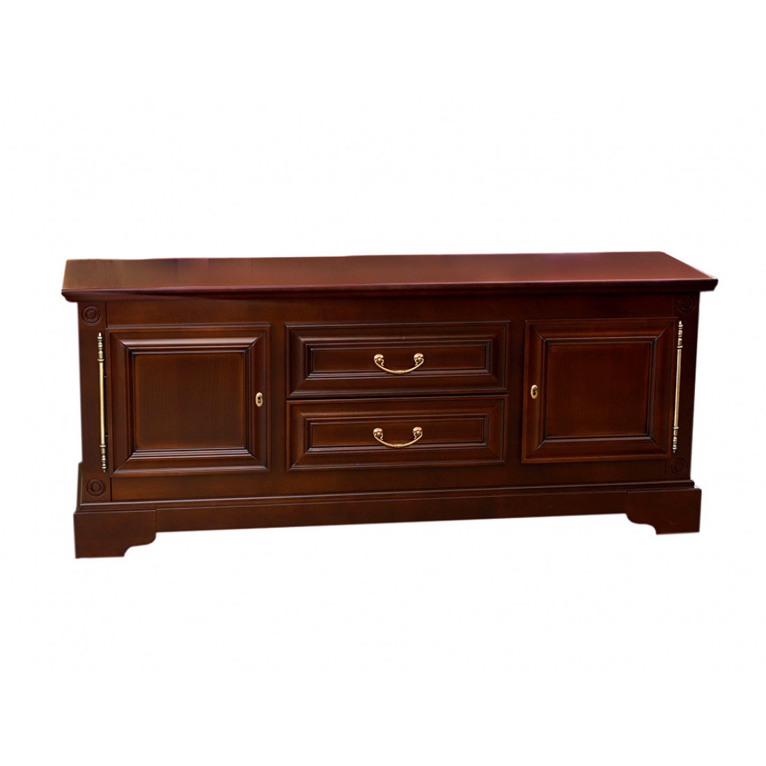 Элегантная классика дизайна и современные тенденции функциональности – тумба под телевизор «Полонез» ММ-174-16. Модель выполнена из массива и шпона бука в сочном бархатном цвете «черешня». Тумба имеет свои специфические свойства: штыревые наружные петли; стильную итальянскую фурнитуру; декорирование изящными резными элементами; два выдвижных ящика по центру; два боковых отделения, которые закрываются на ключ.