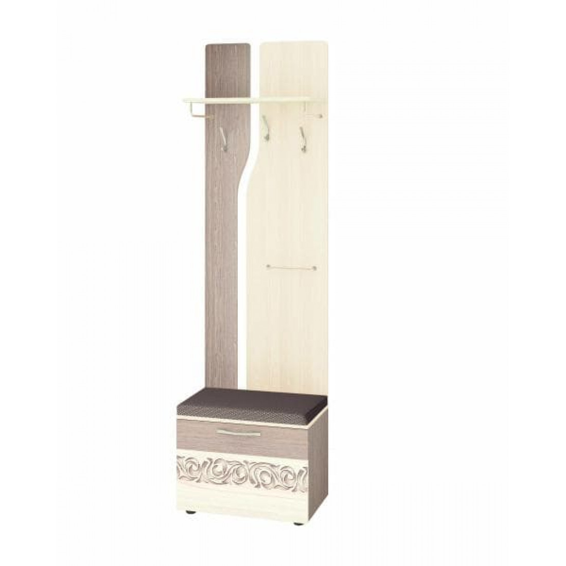 Комбинированная панель с крючками «Мэри 39.09» — элемент модульной программы прихожей «Мэри». В нижней части модуля находится тумба для обуви глубиной 38 см. В верхней — полка для головных уборов и крючки для верхней одежды. Европейская фурнитура Titus позволяет фиксировать откидную дверцу в любом положении. Тумба покрыта мягкой обивкой и выполняет дополнительную функцию сиденья. Ножки регулируются по высоте, что позволяет установить модуль на любой поверхности и скорректировать неровности пола.